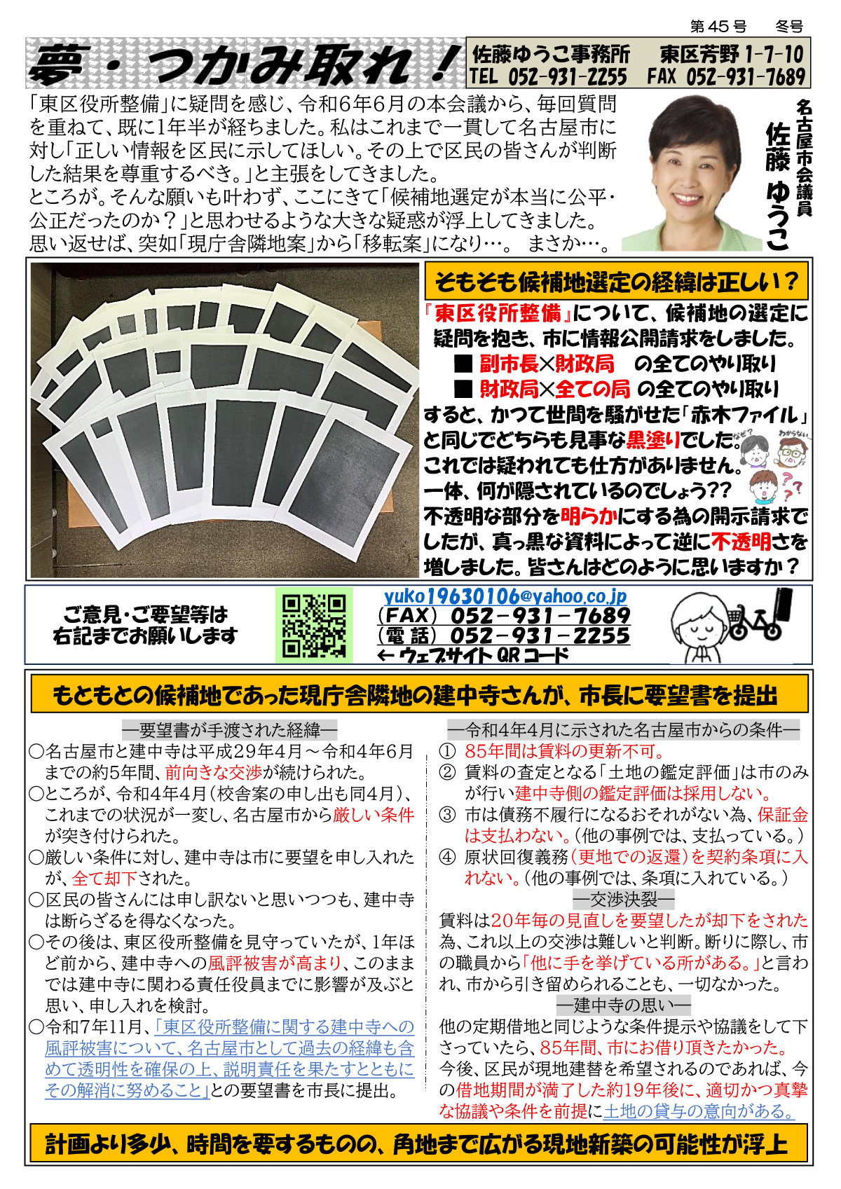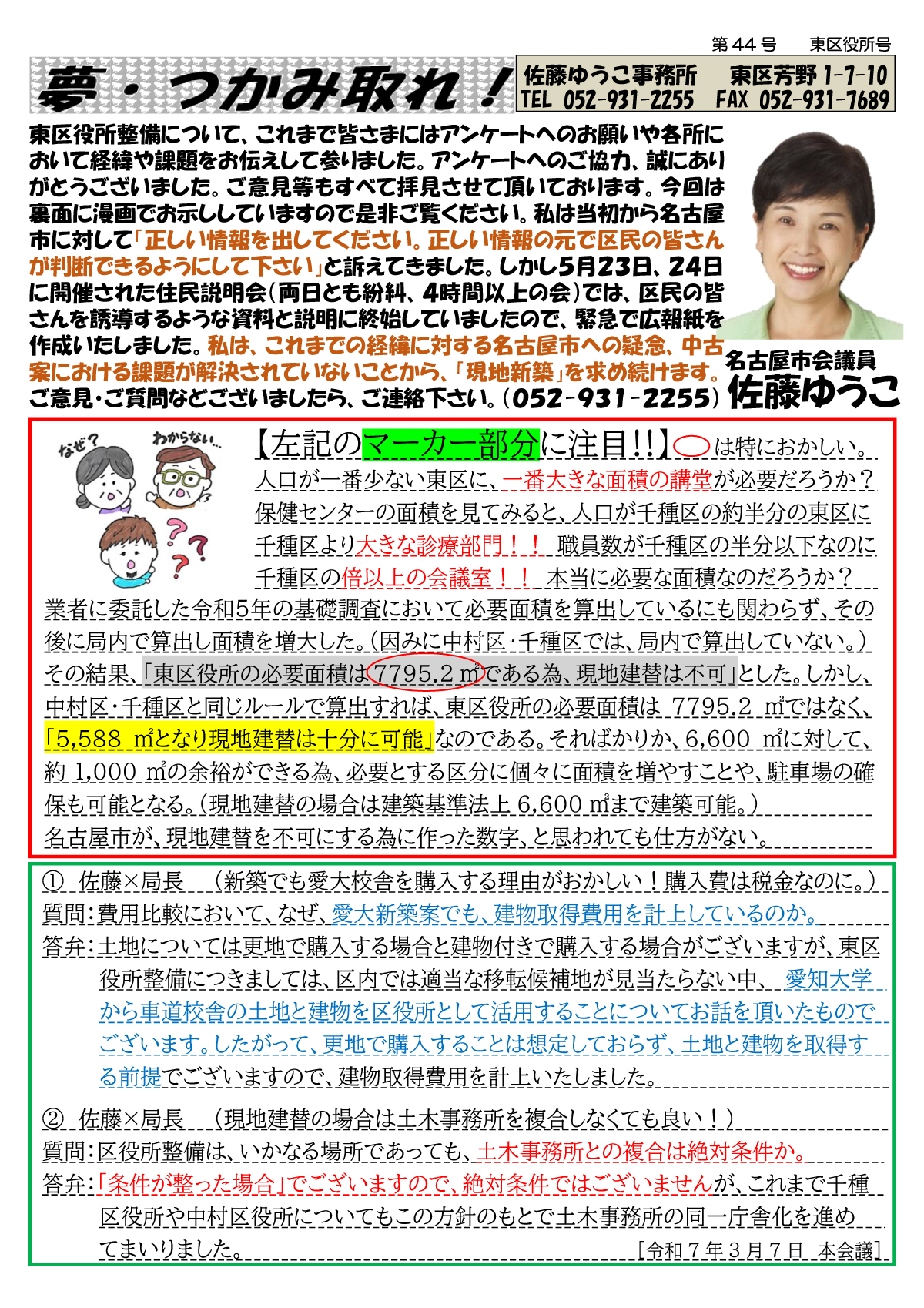東区役所整備について、これまで皆さまにはアンケートへのお願いや各所において経緯や課題をお伝えして参りました。アンケートへのご協力、誠にありがとうございました。ご意見等もすべて拝見させて頂いております。今回は裏面に漫画でお示ししていますので是非ご覧ください。私は当初から名古屋市に対して「正しい情報を出してください。正しい情報の元で区民の皆さんが判断できるようにして下さい」と訴えてきました。しかし5月23日、24日に開催された住民説明会(両日とも紛糾、4時間以上の会)では、区民の皆さんを誘導するような資料と説明に終始していましたので、緊急で広報紙を作成いたしました。私は、これまでの経緯に対する名古屋市への疑念、中古案における課題が解決されていないことから、「現地新築」を求め続けます。